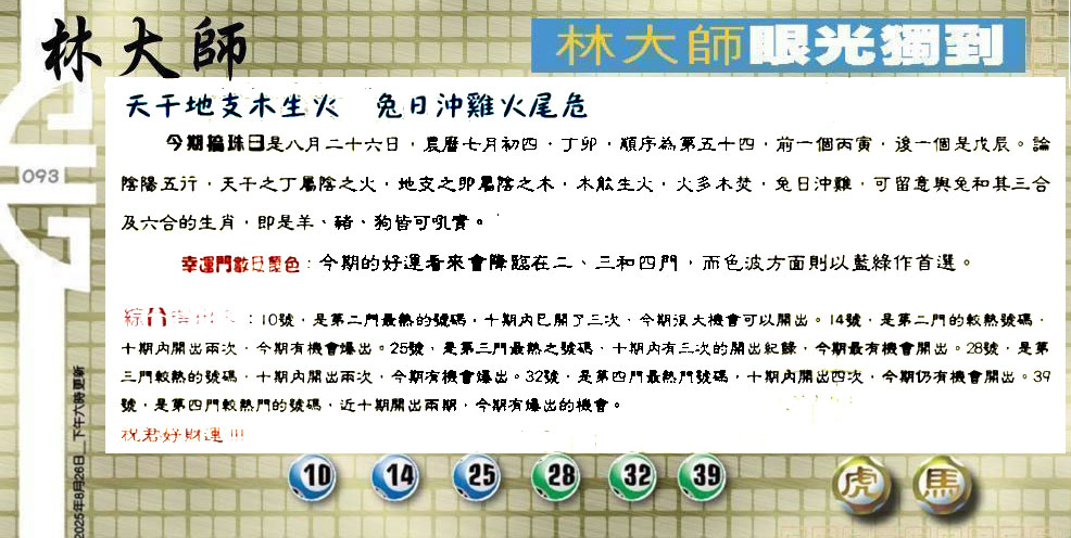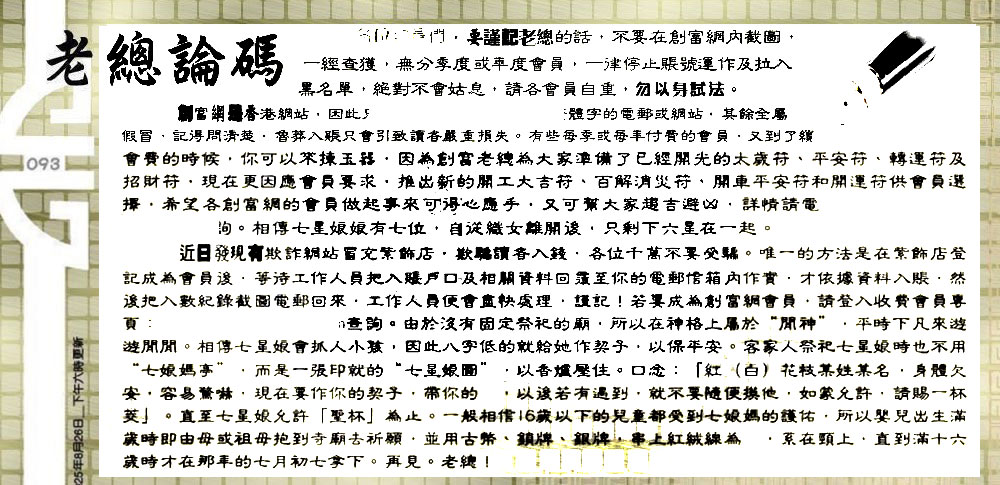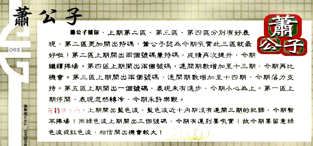 | 主题 :093期:六合皇金句/老总论码/萧公子/林大师/五行夺码/老总信箱截 |