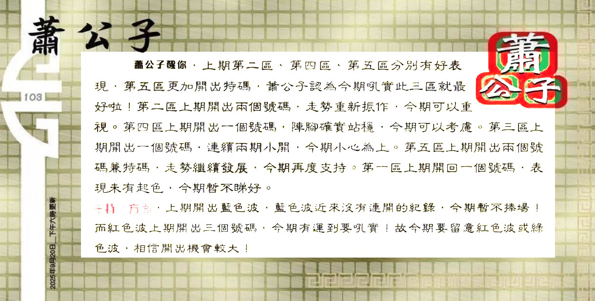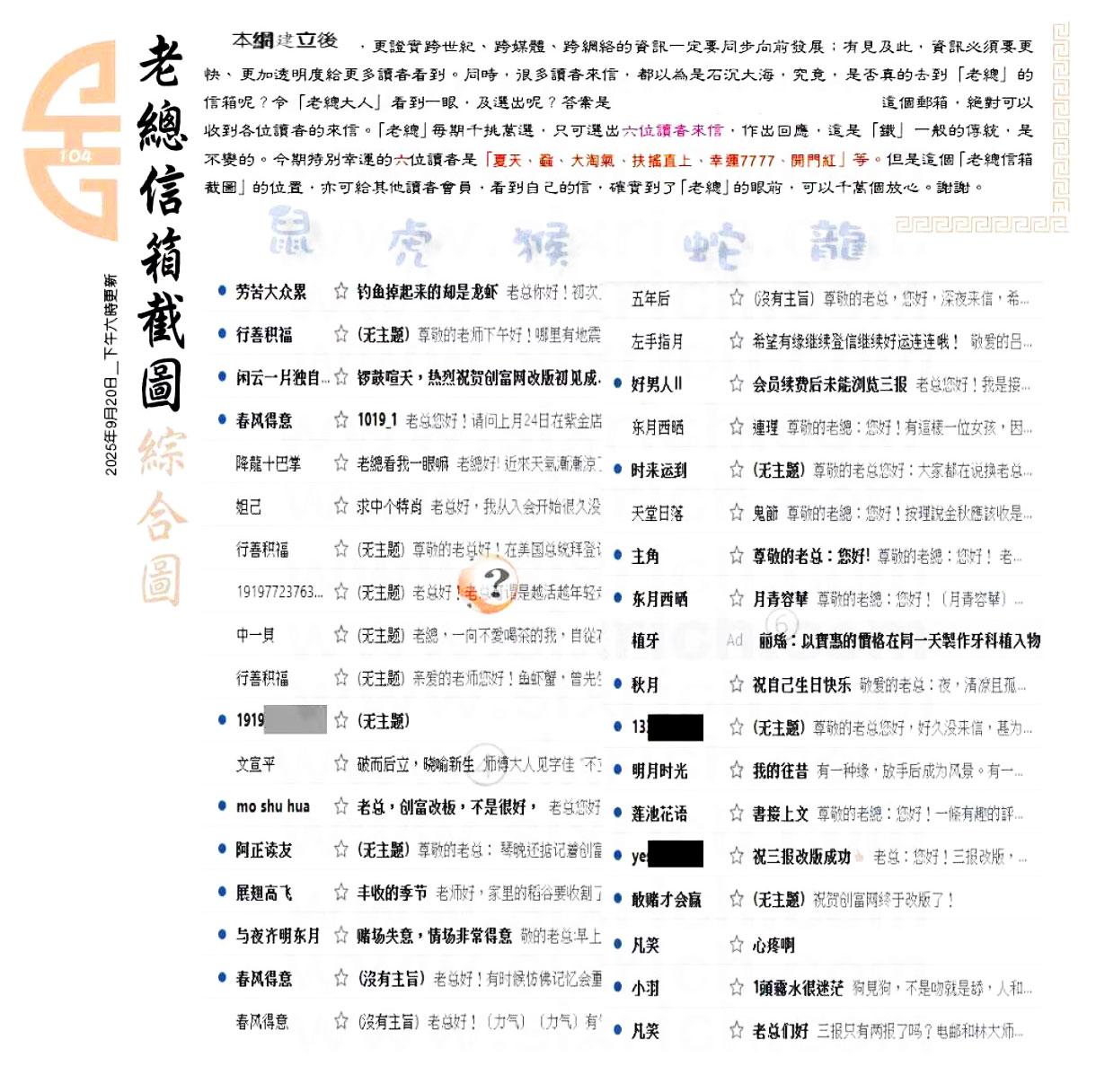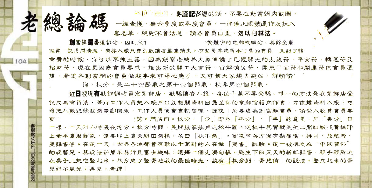 主题 :104期:六合皇金句/老总论码/萧公子/林大师/五行夺码/老总信箱截 |