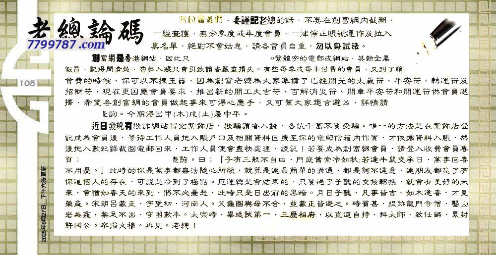 主题 :105期:六合皇金句/老总论码/萧公子/林大师/五行夺码/老总信箱截 |